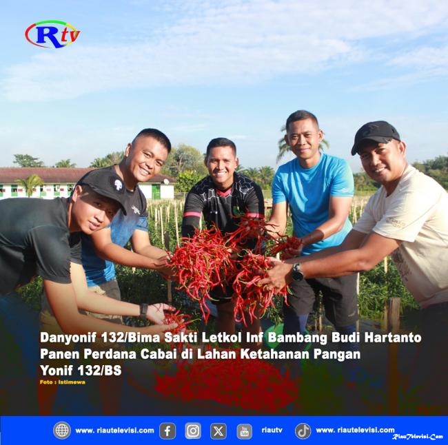 Kampar, riautelevisi.com- Komandan Batalyon Infanteri 132/Bima Sakti, Letkol Inf Bambang Budi Hartanto, memimpin kegiatan panen perdana cabai di lahan ketahanan pangan Yonif 132/BS. Acara ini berlangsung di area lahan ketahanan pangan yang dikelola oleh prajurit Yonif 132/BS sebagai bagian dari program kemandirian pangan. Sabtu (21/12/2024).